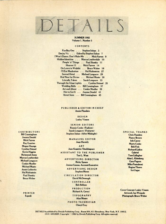 Details, cover and interior portfolio by Bruce Weber and Ian Warpole, Annie Flanders, Publisher. Volume 1, Issue No. 3, Summer, 1982.
