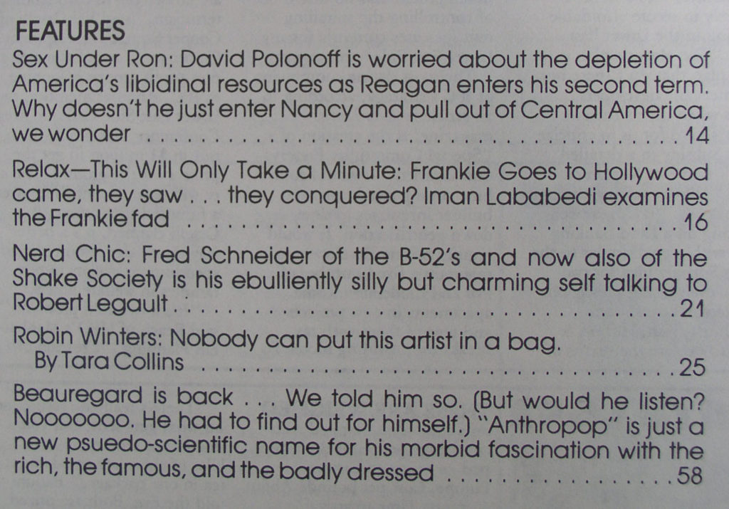 East Village Eye, New Your, 1985, Fred Schneider, Robin Winters, Rudolf, Frankie Goes to Hollywood