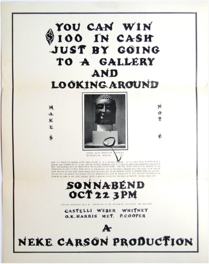 A Neke Carson Production, You Can Win $100 In Cash Just by Going To A Gallery and Looking Around, 1977. Offset on paper. 18 ½ x 15 in.
