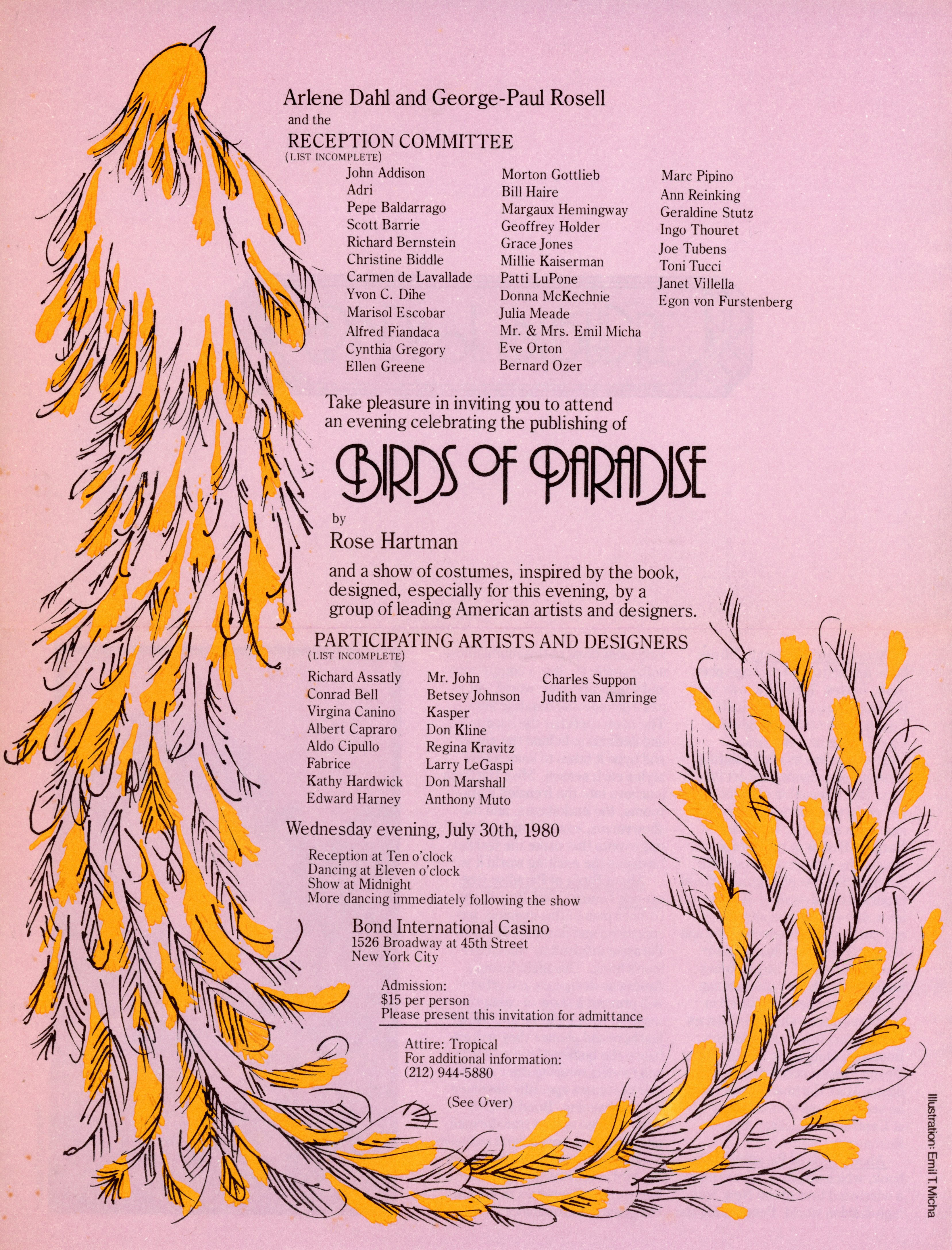 Invitation to the “private party celebrating the birth of the new wave modeling agency LaRocka,” Bond International Casino, Wednesday, July 23, 1980, two-sided, offset printed on folded card stock. 8 ½ x 11 in.