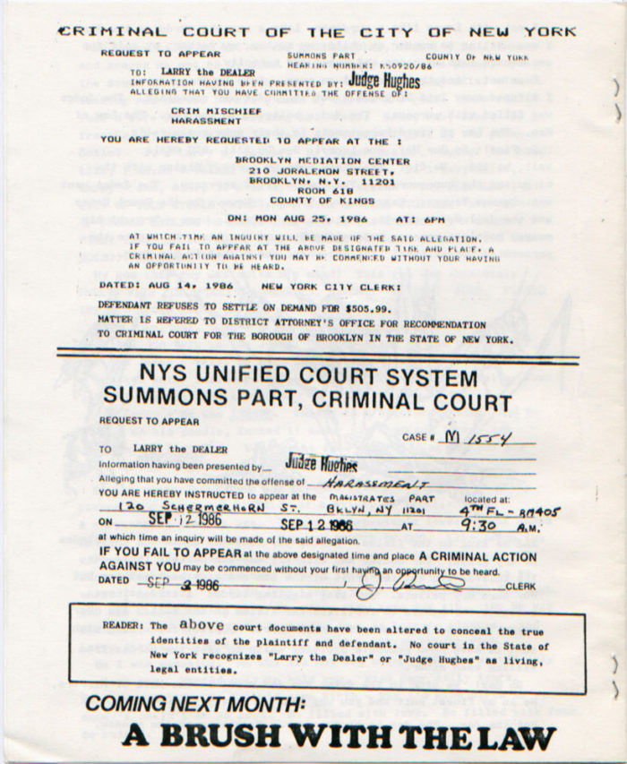 “Break In!” back cover, with ostensible summons issued to “Larry the Dealer” on behalf of Judge Hughes