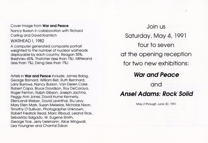 Folded card for two exhibitions at Alinder Gallery, Gualala, CA, 1991: group show War and Peace and Ansel Adams’ Rock Solid. Front fo card features an image by Nancy Burson in collaboration with Richard Carling and David Kramlich, Warhead I, 1982.