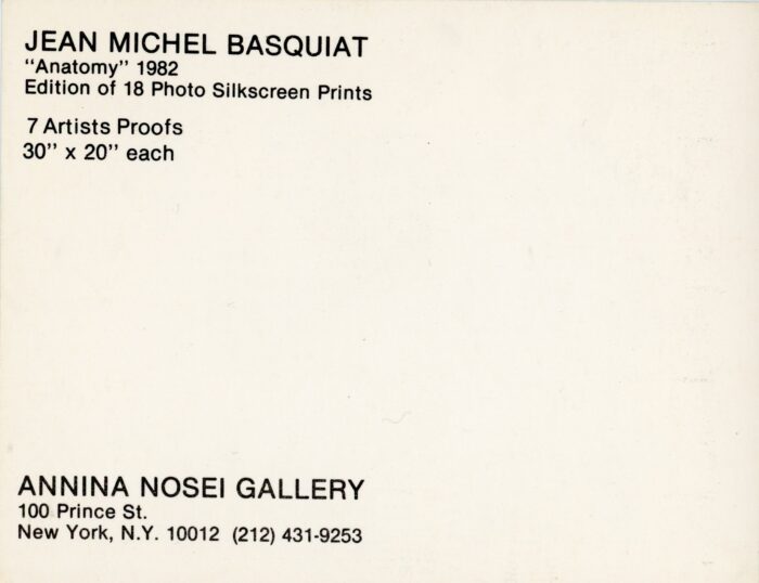 Postcard for an edition of 10 photo silkscreen prints of Jean-Michel Basquiat’s Anatomy, at Annina Nosei Gallery, 1983.