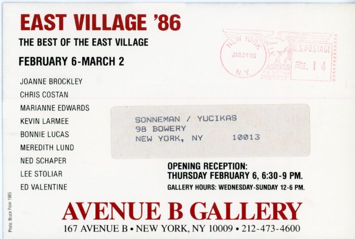 Postcard for East Village ’86: The Best of the East Village, a group show at Avenue B Gallery, February 6 – March 2, 1986. Artists included Joanne Brockley, Chris Costan, Marianne Edwards, and others.