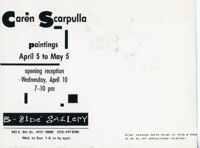 Postcard for Caren Scarpulla’s Paintings at B-Side Gallery, April 5 – May 5. Scarpulla was the founder of B-Side Gallery.