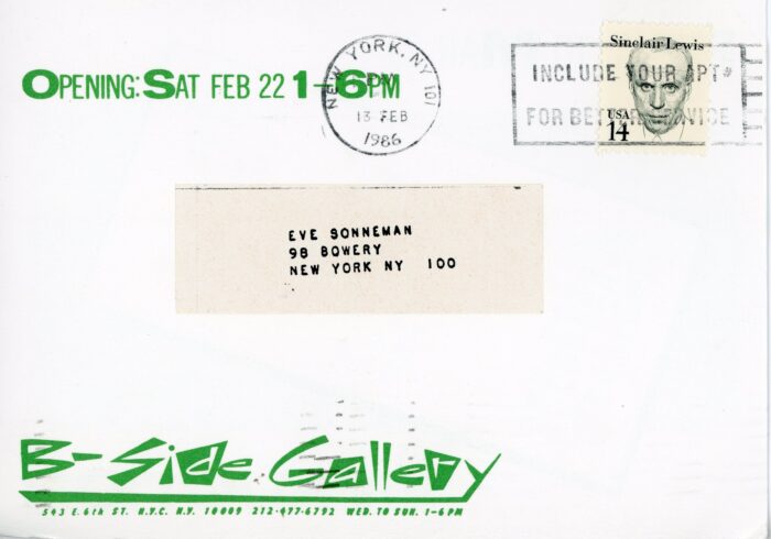 Postcard for a silent auction at B-Side Gallery, February 22 – March 23, 1986. Artists included Lynn Augeri, Linus Coraggio, Luis Frangella, Bobby G, Mark Kostabi, Rick Prol, James Romberger, and Bruce Wall.