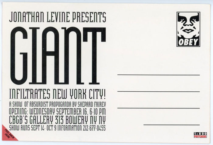Card for Shepard Fairey’s exhibition GIANT (a show of absurdist propaganda.) Presented by Jonathan Levine at CBGB’s Gallery in 1998.