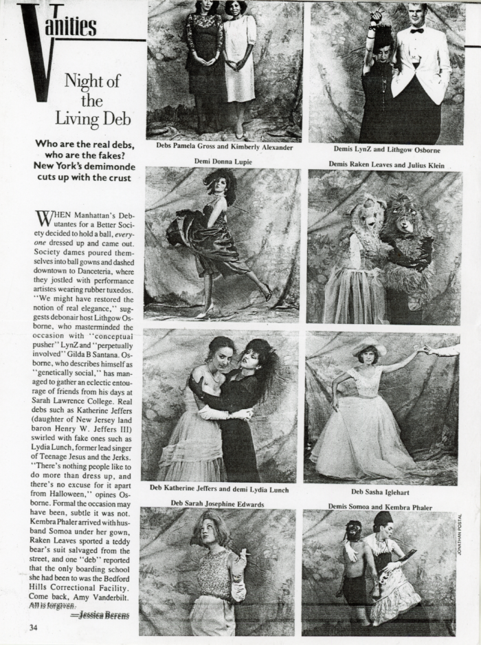 Folded card invitation to the Debutantes for a Better Society Spring Ball at Danceteria, 1984. Debs included Lydia Lunch and Kembra Phaler.