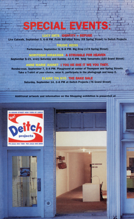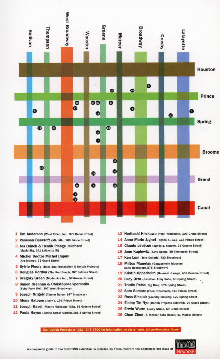 Exhibition companion guides (2: one folded card, one glossy magazine-style booklet) for Shopping, an exhibition with Deitch Projects, 1996. The show consisted of 26 art installations in 26 shops throughout SoHo. Produced by Jeffrey Deitch and curated by Jerome Sans.