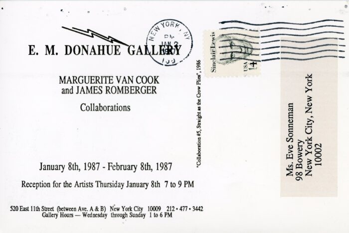 Postcard for Marguerite Van Cook and James Romberger’s Collaborations at E. M. Donahue Gallery, January 8 – February 8, 1987.