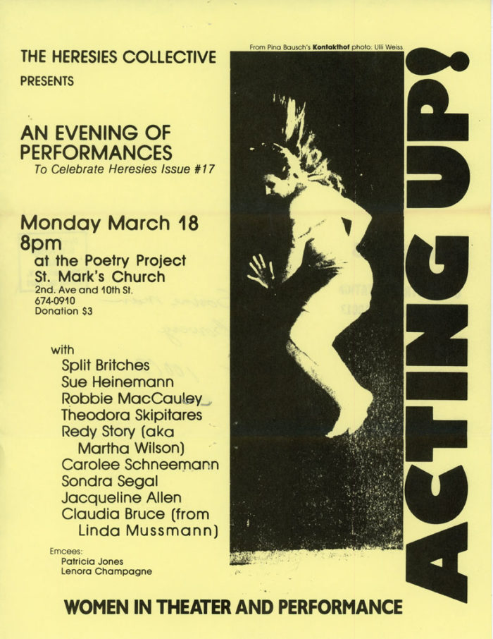 Pina Bausch, Martha Wilson, Carolee Schneemann Acting Up! An Evening of Performances, Heresies, Mailer, 1984