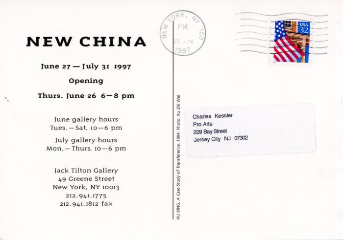 Postcard for New China, a group show at Jack Tilton Gallery, 1997. Front of card features Xu Bing’s A Case Study of Transference, 1994.
