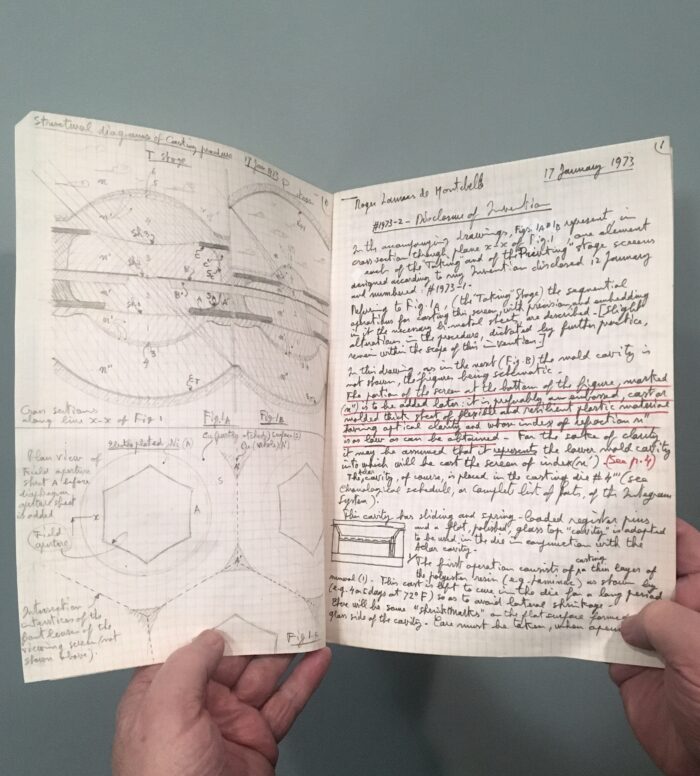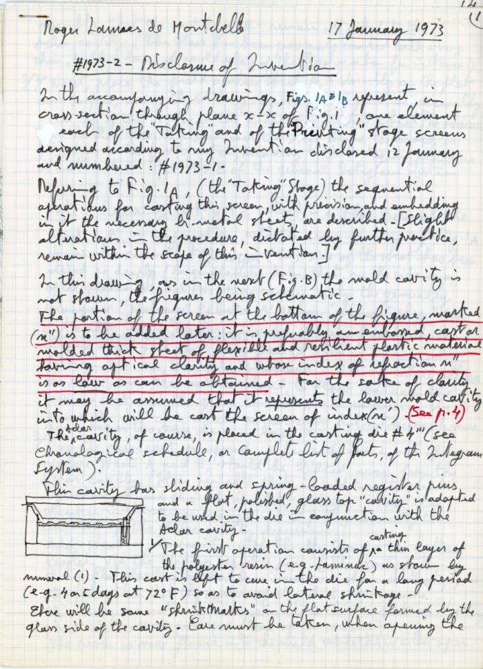 Roger Lannes de Montebello’s Disclosure of Invention, folded sheet graph paper with handwritten notes stapled to the inside, January 17, 1973. Includes hand-drawn diagram and notes related to the casting procedure to obtain integral screens, along with four pages of a handwritten description of de Montebello’s technology.
