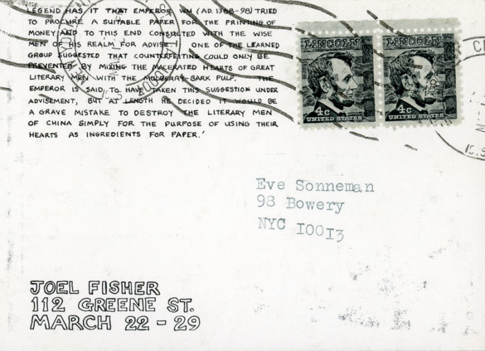 Postcard for Joel Fisher’s exhibition at 112 Greene Street Gallery, 1975.