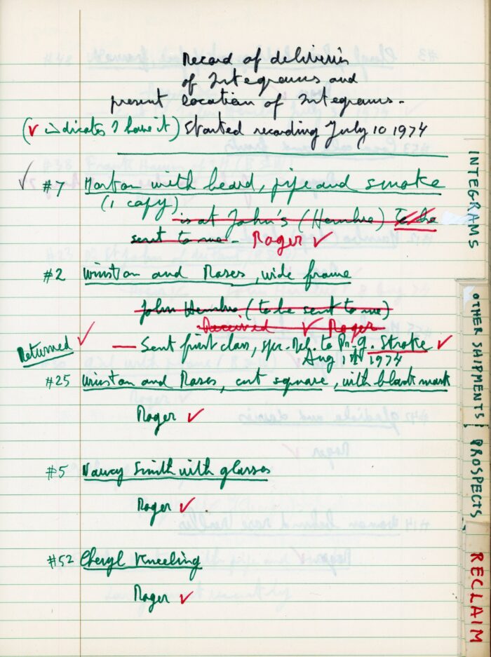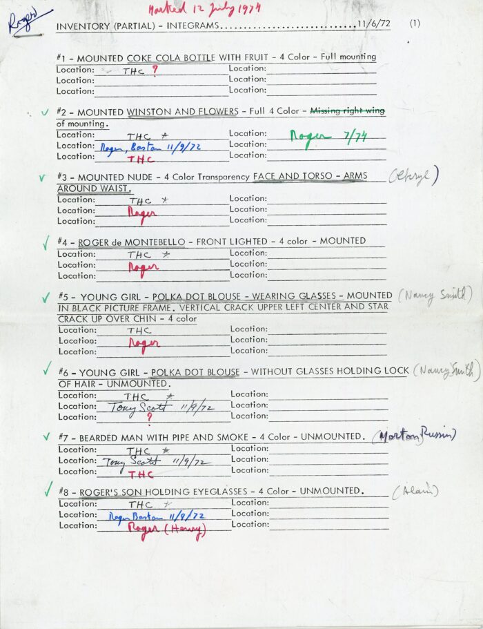 1974, inventory list and shipment info for the Integram photos marketed by the Integram Corp.