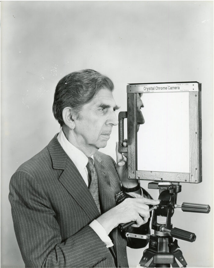 Unidentified Photographer, Portrait of Roger Lannes de Montebello with an improved CrystalChrome Camera, 1985; black-and-white photograph; 8 x 10 inches