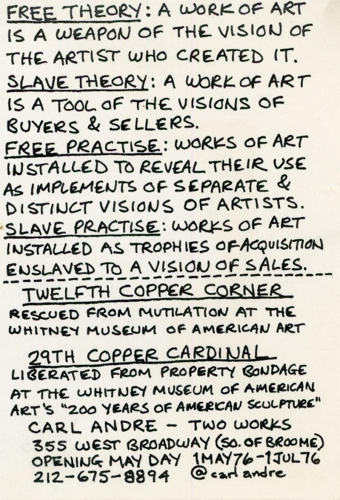Postcard for Carl Andre’s exhibition of Two Works at 355 West Broadway, 1976.