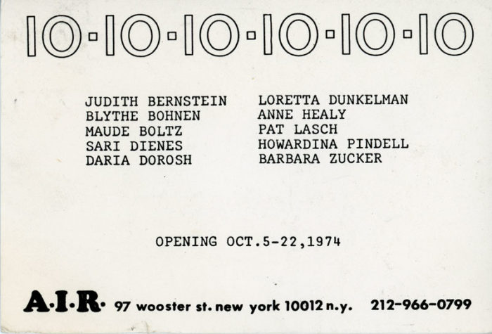 Card for a group exhibition at A.I.R. Gallery, 1974. participating artists included founding members Judith Bernstein, Blythe Bohnen, Maude Boltz, Daria Dosher, Loretta Dunkelman, Anne Healy, Howardena Pindell, and Barbara Zucker, as well as art by Sari Dienes and Pat Lasch.