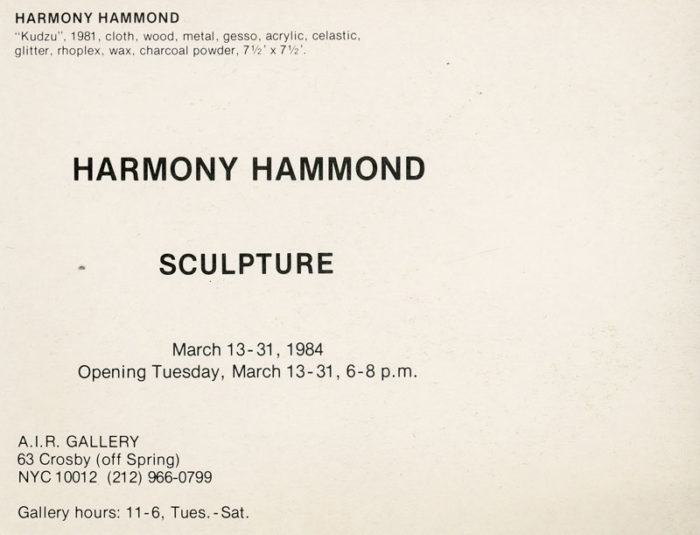 Card for Harmony Hammond’s exhibition Sculpture at A.I.R. Gallery, 1984. Hammond was a founding member of A.I.R. Gallery, an all-female cooperative gallery founded in 1972. Front of card features Hammond’s Kudzu, 1982.