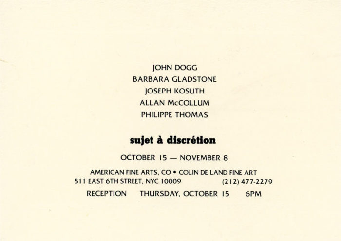 American Fine Arts, John Dogg, Barbara Gladstone, Joseph Kosuth, Sujet á Discrétion, Card and Press Release, 1987