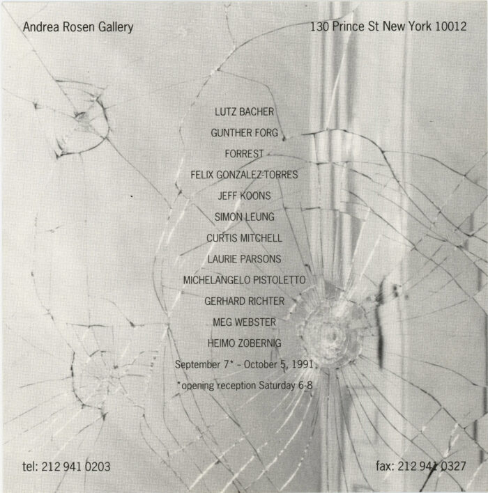 Announcement card for a group show at Andrea Rosen Gallery featuring work by Felix Gonzales-Torres, Jeff Koons, Gerhard Richter and others. September 7 – October 5, 1991