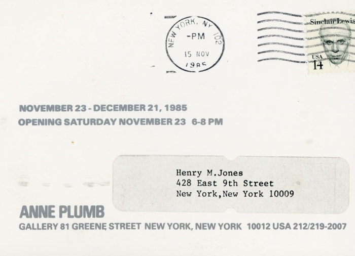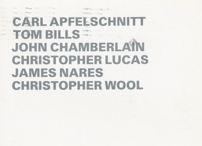 Postcard for a group show at Anne Plumb Gallery, 1985. Artists included Carl Apfelschnitt, Tom Bills, John Chamberlain, Christopher Lucas, James Nares, and Christopher Wool.