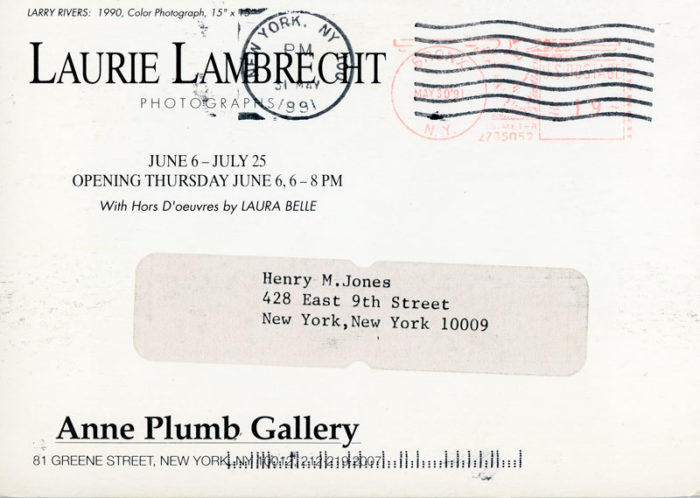 Postcard for Laurie Lambrecht’s exhibition of photographs at Anne Plumb Gallery, 1991. Front of card features Lambrecht’s Larry Rivers, 1990.