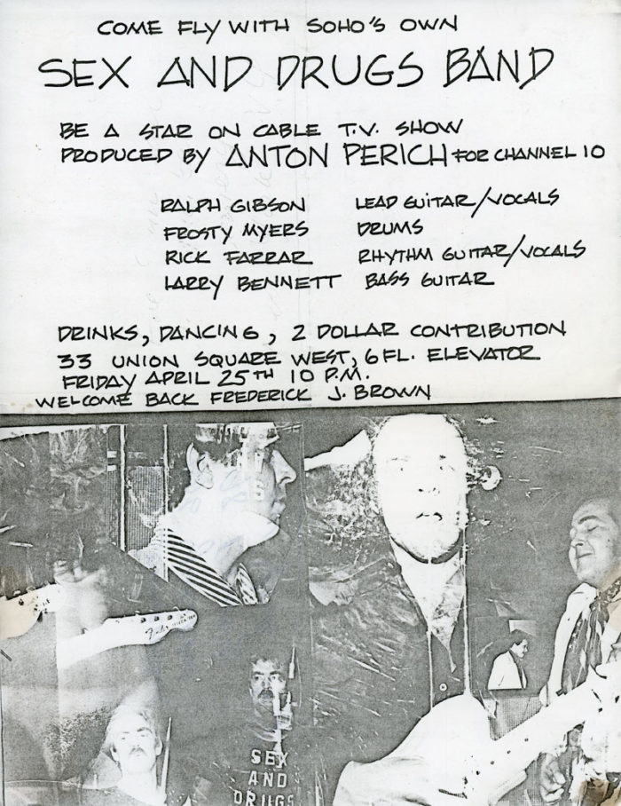 Mailed flyer for the filming of Sex and Drugs Band, produced by Anton Perich for Channel 10. Band included Ralph Gibson, Frosty Myers, Rick Farrar and Larry Bennett.