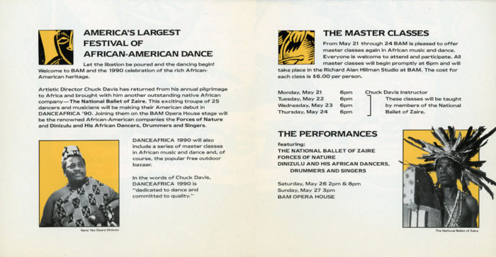 Folded poster for Dance Africa at the Brooklyn Academy of Music, 1990. Back of poster includes programming notes and ticketing information.