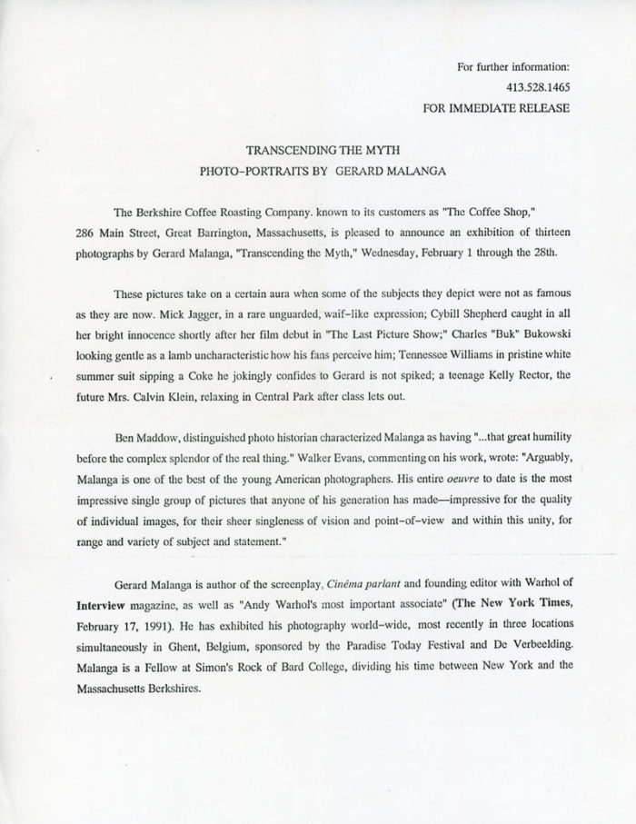 Gerard Malanga, Transcending The Myth, Card and Press Release, Berkshire Coffee Roasting Company