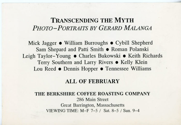 Press release and card for Gerard Malanga’s Transcending The Myth, an exhibition of photo-portraits at The Berkshire Coffee Roasting Company, Massachusetts. Front of card features one of Malanga’s portraits of Mick Jagger.