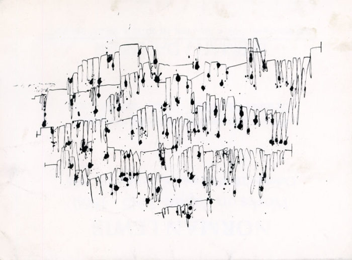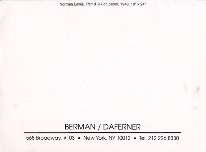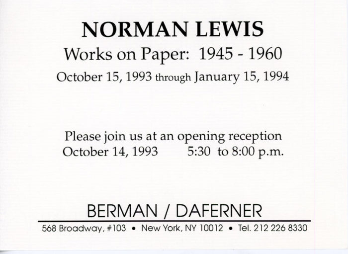 Folded card with insert for Norman Lewis’ Works on Paper: 1945 – 1960 at Berman / Daferner, 1994. Folded card is blank on the inside.