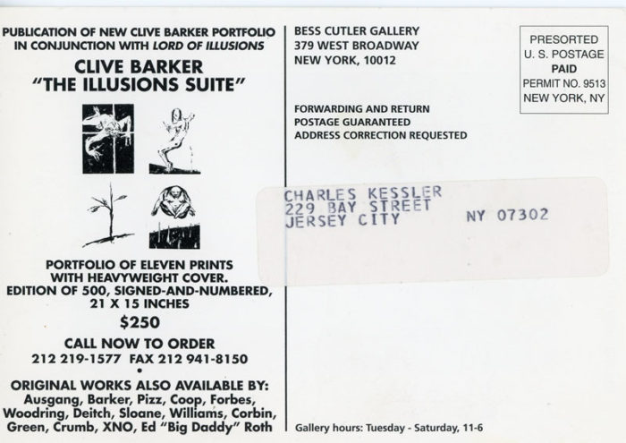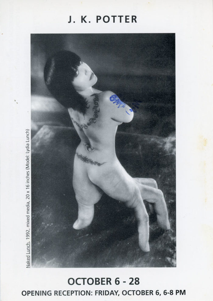 Postcard for J.K. Potter’s exhibition at Bess Cutler Gallery. Front of card features Naked Lunch of Lydia Lunch, 1992. Back of card advertises the publication of Clive Barker’s The Illusion Suite.