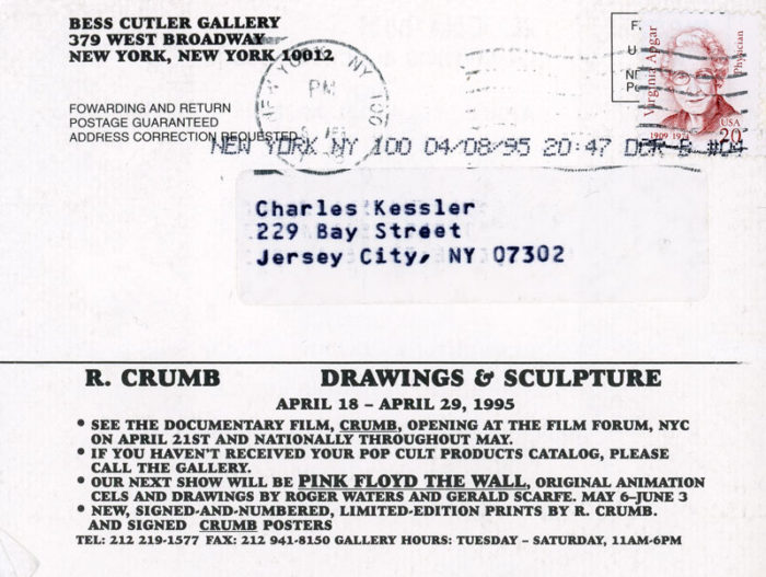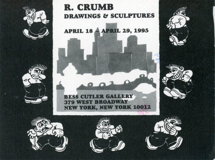 Postcard for R. Crumb’s exhibition of Drawings & Sculptures at Bess Cutler Gallery, 1995.