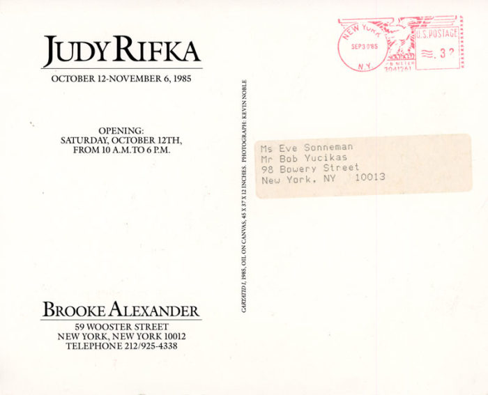 Postcard for Judy Rifka’s exhibition at Brooke Alexander, 1985. Front of card features Rifka’s Caryatid I, 1985. Photo by Kevin Noble.