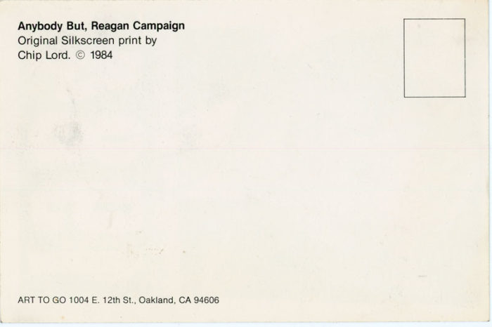 Postcard for Chip Lord (of Ant Farm)’s Anybody But, Reagan Campaign, an original silkscreen print printed in 1984.