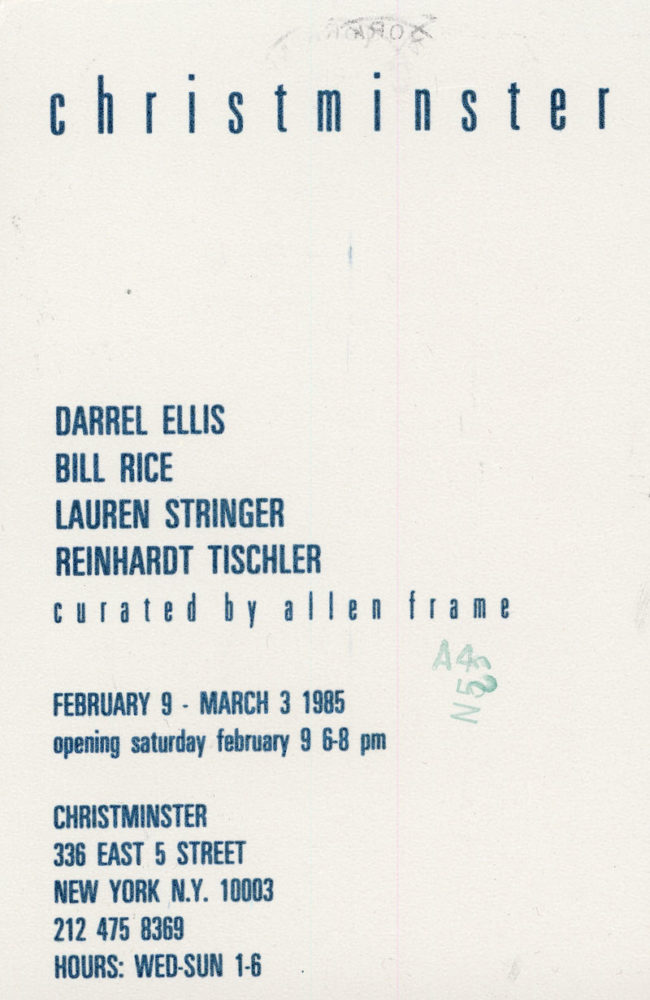 Postcard for a group show curated by Allen Frame at Christminster, 1985.  Artists included Darrel Ellis, Bill Rice, Lauren Stringer, and Reinhardt Tischler.