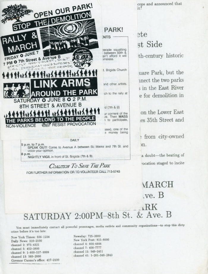 3 Stapled flyers for demonstrations, rallies and actions to save Tompkins Square Park distributed by the Coalition ot Save The Park.