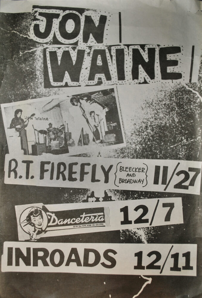 Large flyer for Jon Waine performances at R.T. Firefly (11/27), Danceteria (12/7), and Inroads (12/11), c. 1982.
