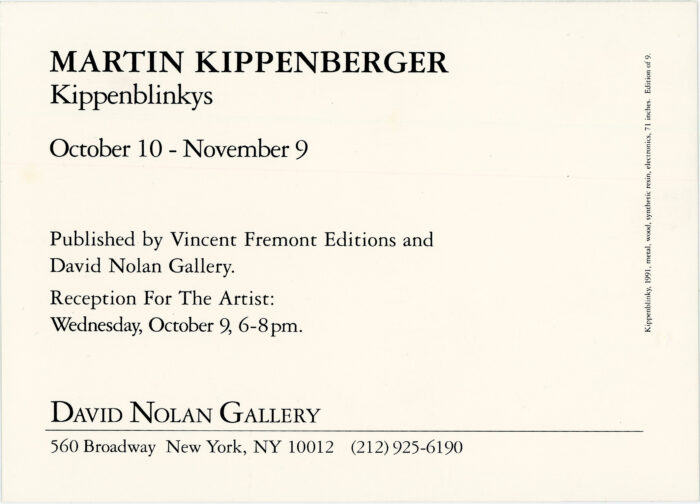 Announcement card for an exhibition at David Nolan Gallery of Martin Kippenberger’s “Kippenblinkys” on the occasion of the release of a sculpture edition by the same name. October 10 – November 9, 1991.