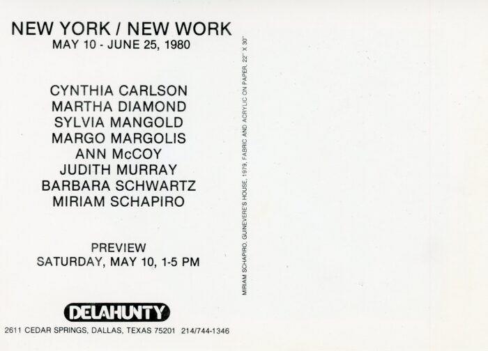 Announcement card for a group exhibition entitled “New York / New Work” at Delahunty (Dallas, TX) featuring work by Miriam Schapiro and Sylvia Mangold among others, May 10 – June 25, 1980.
