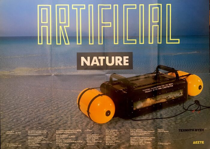 Folded poster for Artificial Nature curated by Jeffrey Deitch at the Deste Foundation, 1990. Front of poster features a sculpture by Ashley Bickerton. Participating artists include Jeff Koons, Ashley Bickerton, Martin Kippenberger, Peter Nagy, Edward Ruscha, Andy Warhols and others.