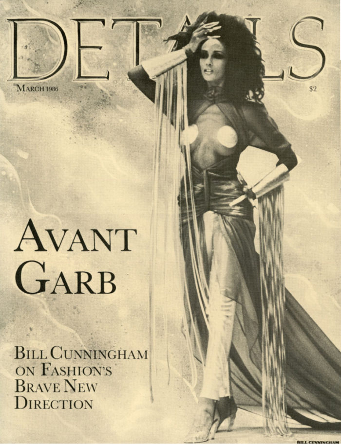 Counter card for the March issue of DETAILS Magazine, 1986. The photo on this counter card is by Bill Cunningham from the special article of his fashion photos and reviews of the Spring collections, Avant Garb. This is not the issue itself, but rather a large advertising counter card that was used in news stands to promote the new issue, and is perfectly suited for framing.