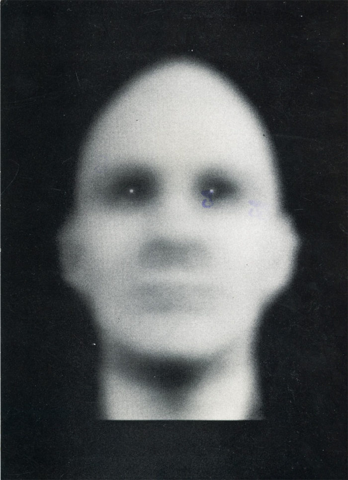 Postcard for Nancy Burson’s exhibition at Jayne H. Baum Gallery, 1990. Front of card features Burson’s Untitled, 1988.