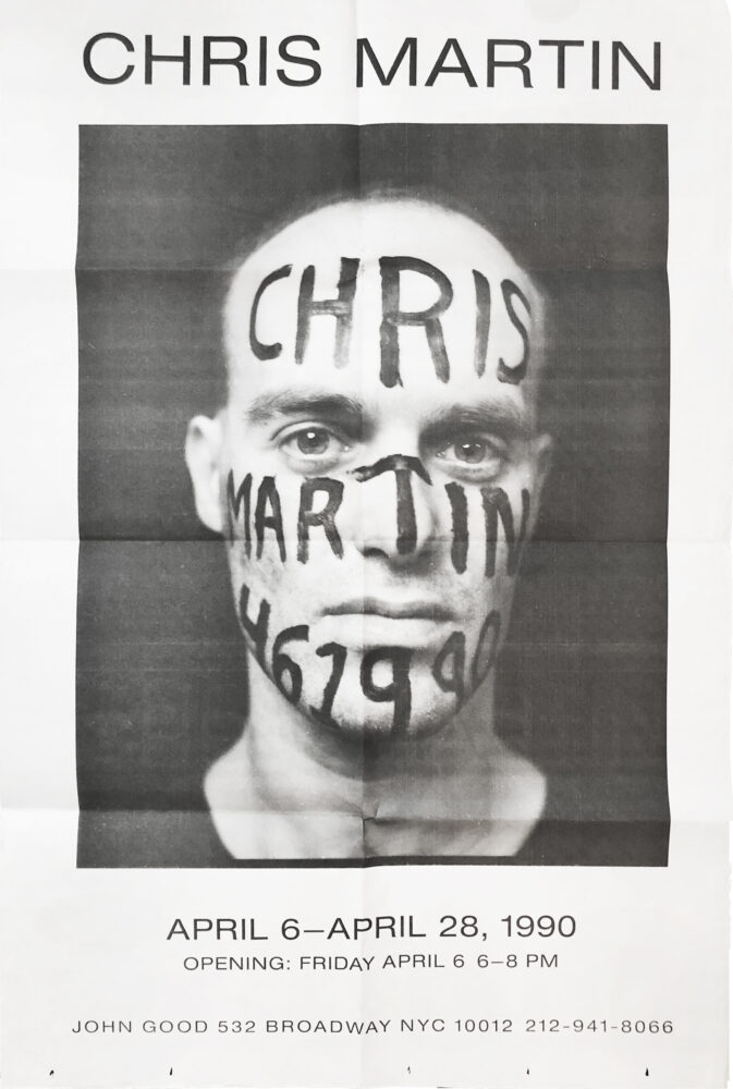 Poster for an exhibition by Chris Martin at John Good Gallery, April 6 – 28, 1990.