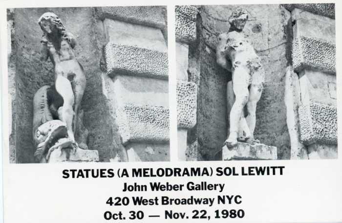 Postcard for Sol Lewitt’s exhibition Statues (A Melodrama) at John Weber Gallery, 1980.