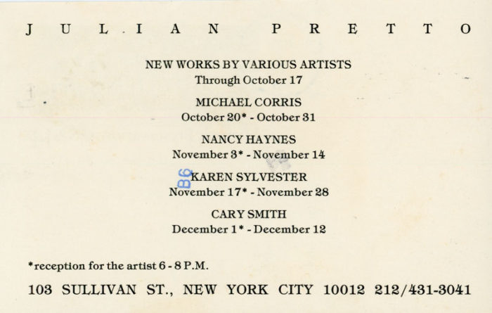 Postcard for New Works by Various Artists, including Michael Corris, Nancy Haynes, Karen Sylvester and Cary Smith, at Julian Pretto Gallery, 1987.