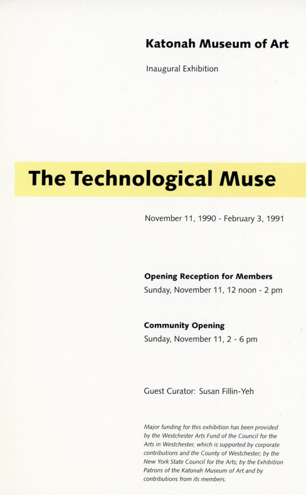 Folded card for The Technological Muse guest curated by Susan Fillin-Yeh at the Katonah Museum of Art, 1991. Front of card features Nam June Paik’s John Cage, 1990.