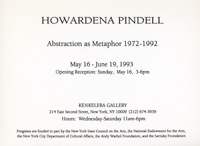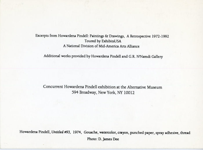 Folded card for Howardena Pindell’s exhibition Abstraction as Metaphor 1972-1992 at the Kenkeleba Gallery, 1993. Front of card features Pindell’s Untitled #93, 1974.