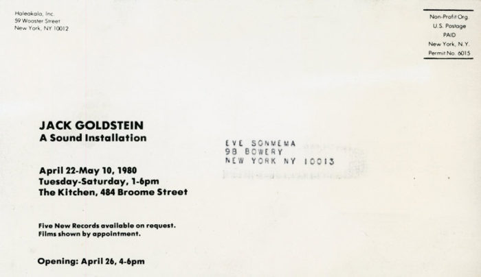 Postcard for Jack Goldstein’s exhibition, A Sound Installation, at The Kitchen, 1980.